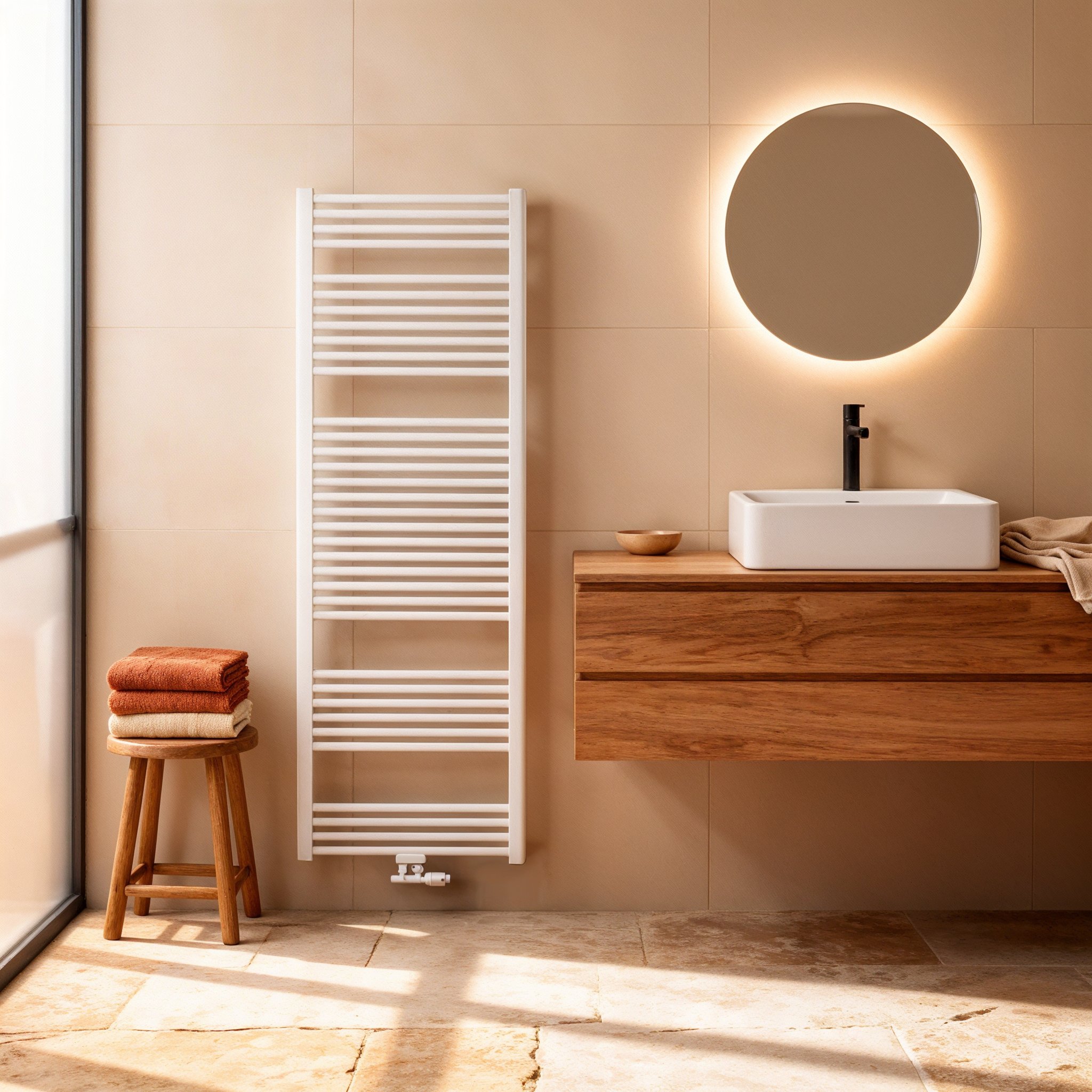 De Thermrad Core-6 handdoekradiator is verkrijgbaar in 7 verschillende maatvoeringen in de kleur wit (RAL9016). Dit basismodel heeft 6 aansluitingen en is hierdoor universeel inzetbaar. Het assortiment handdoekradiatoren met D-profiel collectoren en horizontale ronde buizen is een prima keuze in elke badkamer. Het kunststof afdekkapje voor de midden-onderaansluiting geeft een fraaie afwerking. Thermrad Core-6 handdoekradiatoren worden compleet geleverd inclusief bevestigingsmateriaal en radiator stoppen.
